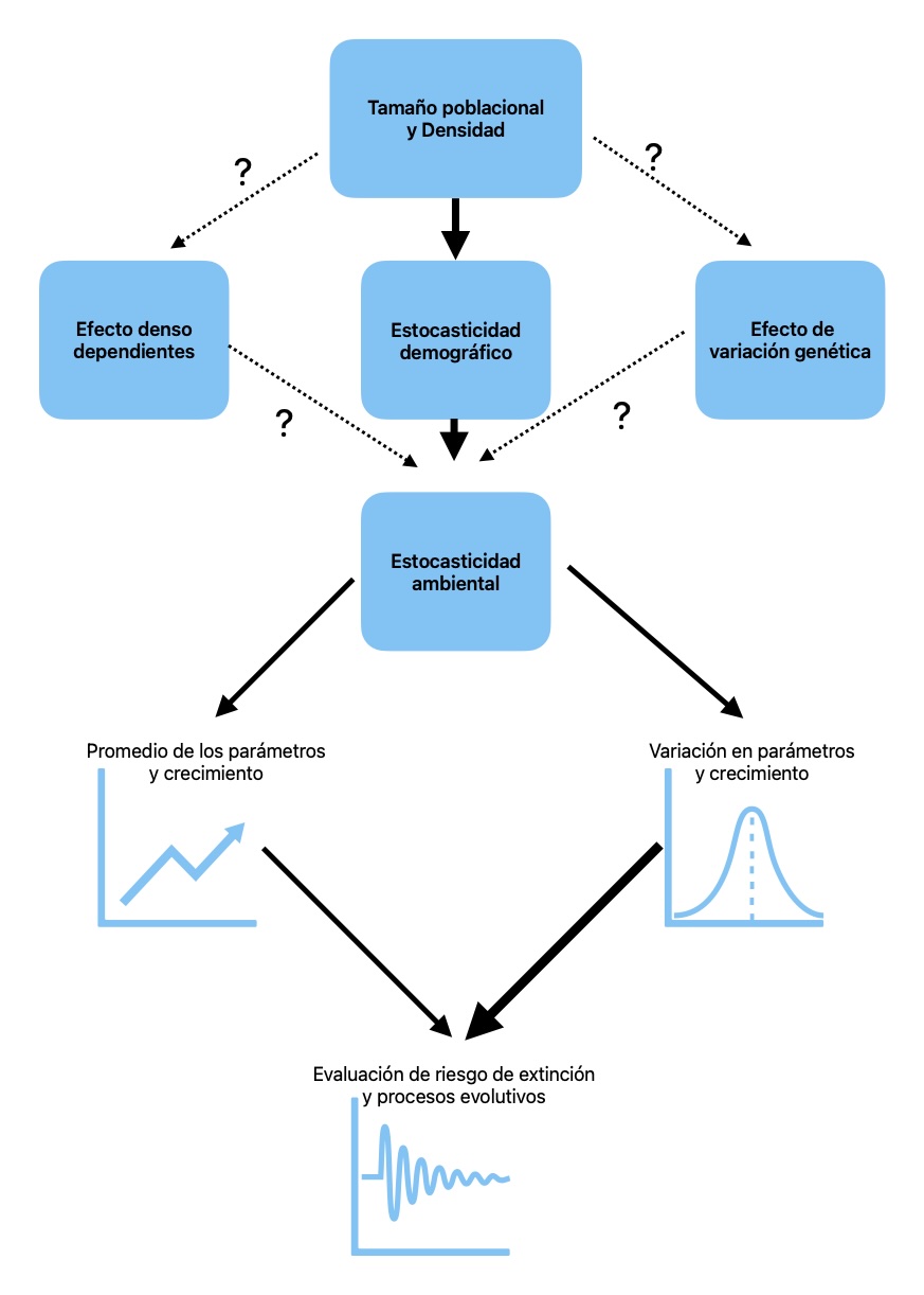 En la figura se ilustran los factores principales que influyen en el crecimiento poblacional y las variables más relevantes para evaluar el riesgo de extinción. Todo análisis de dinámica poblacional parte del tamaño de la población (N) o su densidad, ya que este parámetro impacta directamente otros factores demográficos. En el diagrama, las líneas entrecortadas con signos de interrogación indican relaciones con poca o nula evidencia en orquídeas, mientras que las líneas continuas representan factores respaldados por estudios.