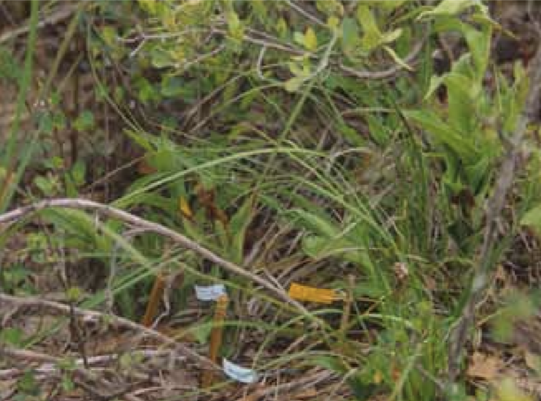 En las orquídeas terrestres Cypripedium irapeanum y Govenia lagenophora las etiquetas de aluminio o cinta dymo fueron amarradas con alambre plastificado a palos o clavos, semejando banderitas, las cuales fueron clavadas en el suelo cerca de los tallos o pseudbulbos de las plantas.