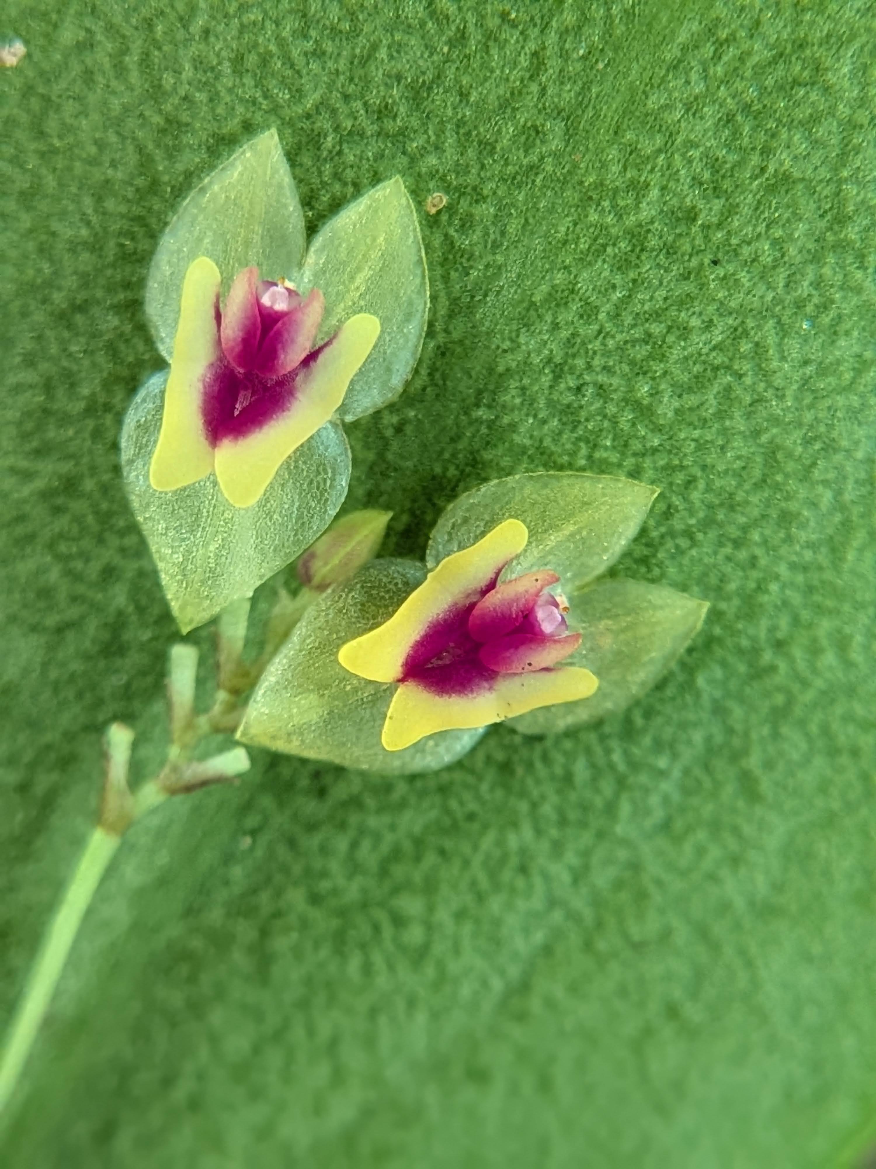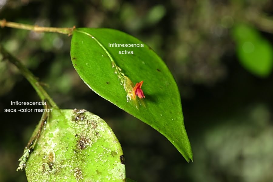 Por ejemplo en la foto que sigue tenemos un individuos que tiene dos hojas, una con inflorescencia activa y la otra hoja con inflorescencia secas, por consecuencia ese individuos es un adulto ya que tiene por los menor una inflorescencia activa (produciendo flores o el potencial de producir flores). Nota no es que la inflorescencia tenga flores es que la inflorescencia es verde (el potencial de producir flores). Hay que reconocer que la vida de una flor puede ser muy corto, y que el muestreo es puntual y no todas las flores se van a poder contabilizar (En algunas especies de Lepanthes las plantas florecen todo el año). Debido que no todas las flores se pueden evaluar cuando estan abierto para remoción del pollinio (esfuerzo reproductivo masculino) o deposición de polen sobre el estigma (esfuerzo reproductivo femenino) se puede contabilizar la cantidad de flores contando las cicatrices de la inflorescencia.