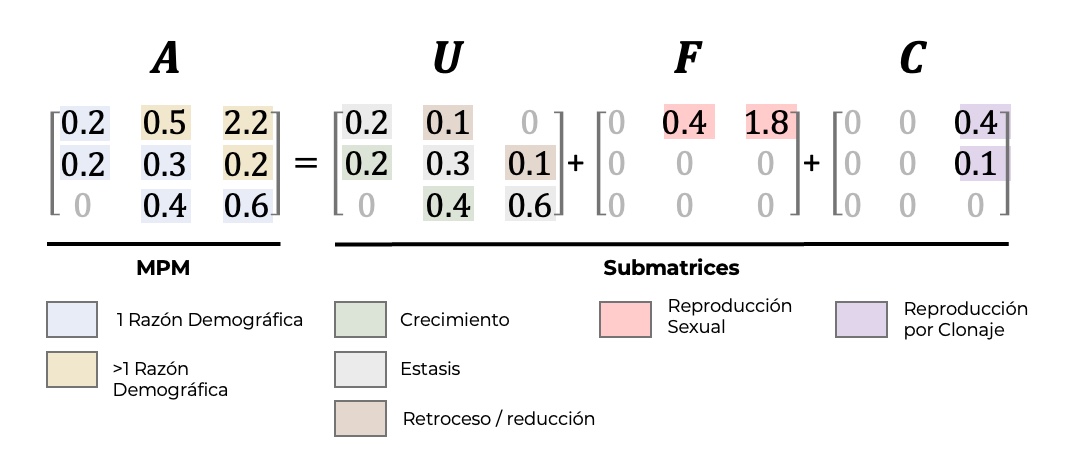 Para facilitar los análisis e interpretaciones es necesario tener claro el ciclo de vida de la especie y el origen de los parámetros de transiciones, fecundidades y clonaje. Para lo cual, hay que recordar que la matriz A (matA), para evaluar varios de los parámetros del crecimiento poblacional, es el resultado de la suma de las submatrices de transición, de fecundidad y de clonación. Un ejemplo de por qué es necesario crear submatrices es que, para calcular la supervivencia promedia y sus intervalos de confianza, se necesita la matriz de transiciones matU separado de la matriz de fecundidad, mientras que para calcular la tasa de crecimiento poblacional, se necesita matA. En adición si uno quiere un estimado de la endogamia es importante reconocer la importancia de la clonación en la dinámica poblacional, se necesita incluir matC. Por consecuencia, es importante tener claro el ciclo de vida y la forma de reproducción de la especie que se está estudiando. La definición de las matrices U, F y C se basa directamente en los procesos de transición descritos en el capítulo sobre transiciones demográficas. La combinación de las matrices U, F y C permite derivar la tasa de crecimiento poblacional discutida en el capítulo sobre crecimiento poblacional.
