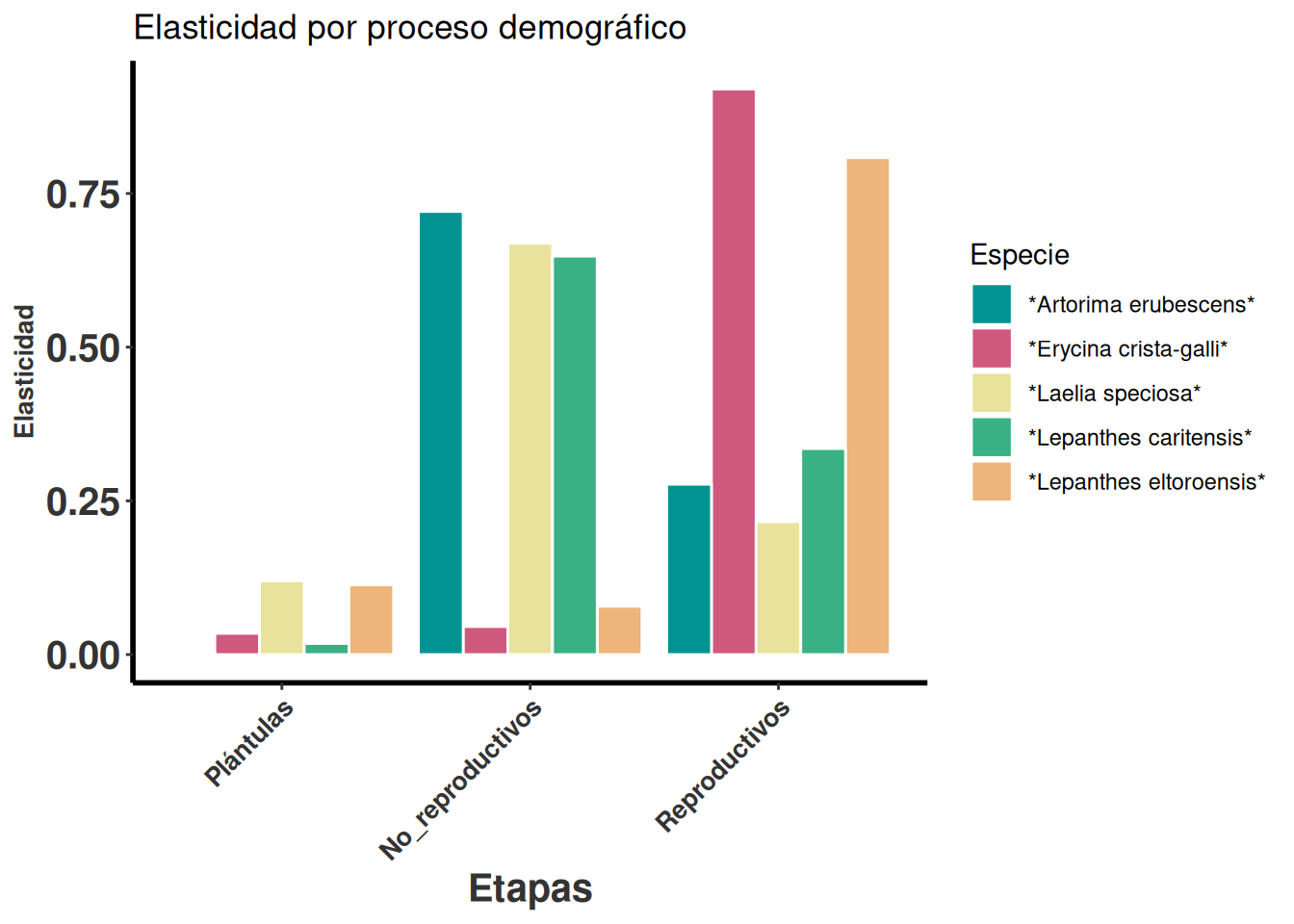 En la siguiente figura se observa la elasticidad agrupado por plántulas, individuos no reproductivos y reproductivos. Se observa que los valores de elasticidad son más altos en los s de no reproductivo en tres especies y reproductivos (adultos activos) en dos especies. Las plántulas tienen las elasticidad más pequeñas en todas las especies.