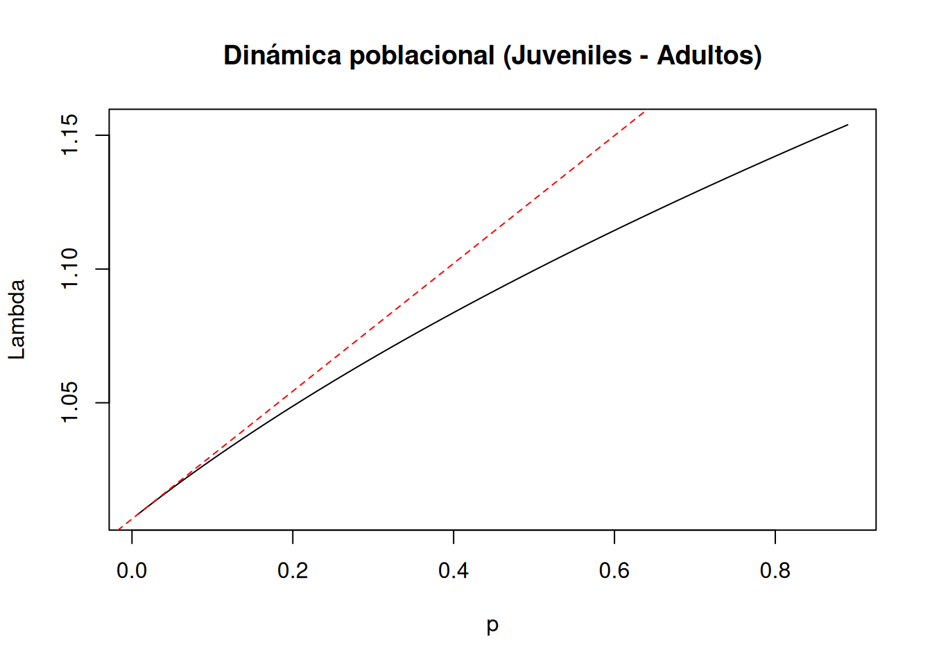El código para el cálculo de la inercia poblacional se presenta en el siguiente recuadro. En este se supone que la población está representada por el último estado del ciclo de vida. Los resultados de la gráfica (extremo inferior derecho) sugieren que cuando todos los individuos de L. rubripetala se encuentran en la fase de adulto reproductivo, la inercia poblacional a corto plazo será mayor a 1.4, lo que sugiere que la población puede crecer por más del 40% antes de alcanzar la tasa constante de crecimiento poblacional. Asimismo, estos resultados indican que los adultos reproductivos tienen un alto impacto positivo sobre la tasa de crecimiento poblacional, a excepción de la transición juveniles a adultos no reproductivos.