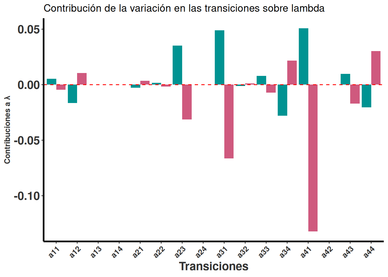 x = "Transiciones", y = "Contribuciones a λ") + rlt_style_fill() +