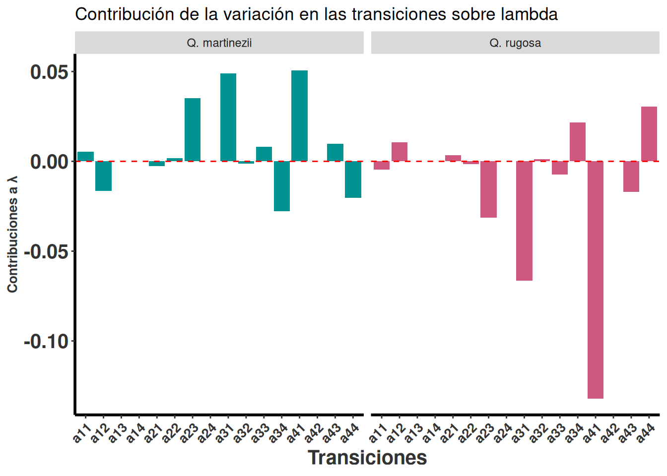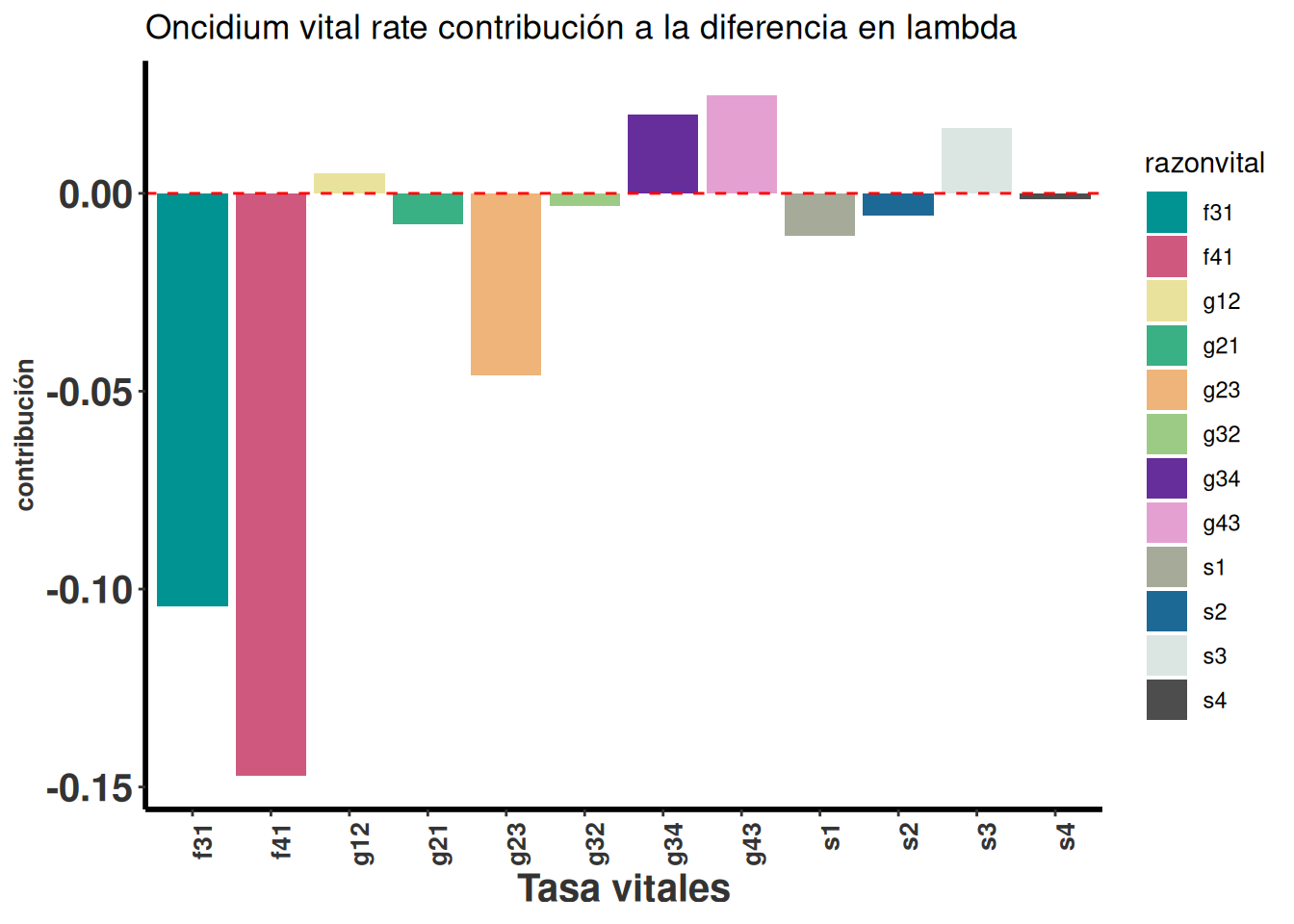 Aquí se observa el efecto de las transiciones de las tasas vitales sobre la variación en λ para las dos especies de hospedero. Las barras positivas indican contribuciones positivas a la variación en \(\lambda\), mientras que las barras negativas indican contribuciones negativas sobre \(\lambda\). El efecto de las transiciones de las tasas vitales sobre la variación en λ es diferente para cada especie de hospedero, no solamente el efecto sobre las tasa vitales son diferentes pero entre hospedero pero los cambios relativos. Lo que indica que las dinámicas poblacionales de Oncidium brachyandrum son influenciadas por el hospedero en el que crece. Este patrón de cambios de tasa vitales y su importancia relativa en la variación de λ necesita ser estudiado en más especies de orquídeas epífitas para entender si es un patrón generalizado o no. Por consecuencia el proximo paso es evaluar cual son la características de las especies de hospedero que influyen en la dinámica poblacional de las orquídeas epífitas.