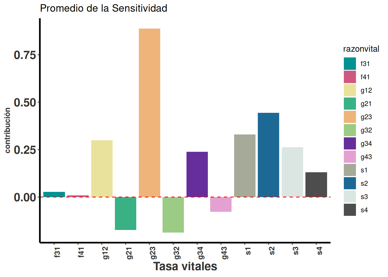 Como el ERTV es una forma de análisis retrospectivo y es análogo al ANOVA (porque cuantifica los efectos observados de los elementos individuales de matriz sobre la variación observada en λ, en contraposición a los efectos esperados) se requiere de un valor de referencia para realizar las comparaciones, por lo que se toma la matriz con el valor más alto de λ como valor de referencia (Caswell, 2010; Timsina et al., 2021).