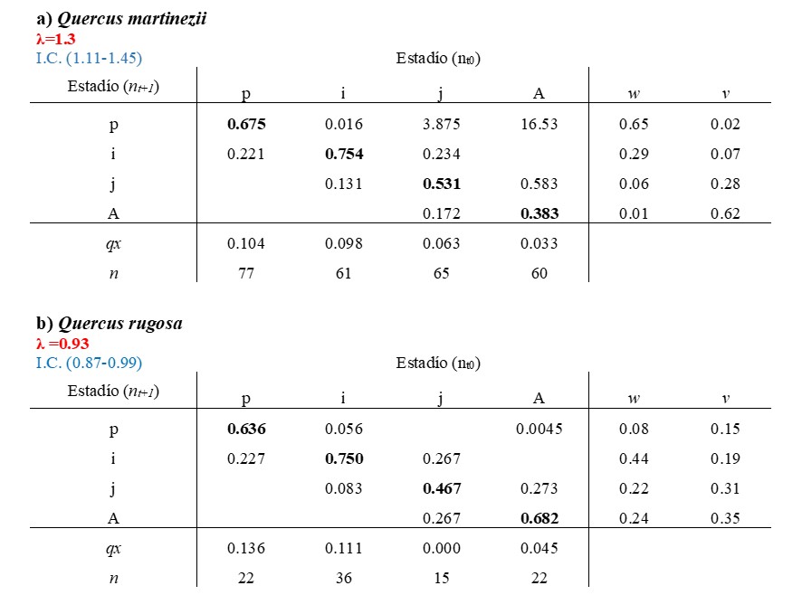 A continuación, se muestran dos matrices de tipo Lefkovitch (matrices construidas con base en estadíos) para las poblaciones de O. brachyandrum y sus valores respectivos de λ en los dos hospederos, A) Q. martinezii (λ=1.3; IC: 1.11-1.45) y B) Q. rugosa (λ=0.98; IC: 0.87-0.99). El valor de λ fue mayor en Q. martinezii por lo que la matriz de esta especie fue la matriz de referencia para calcular los ERTV.