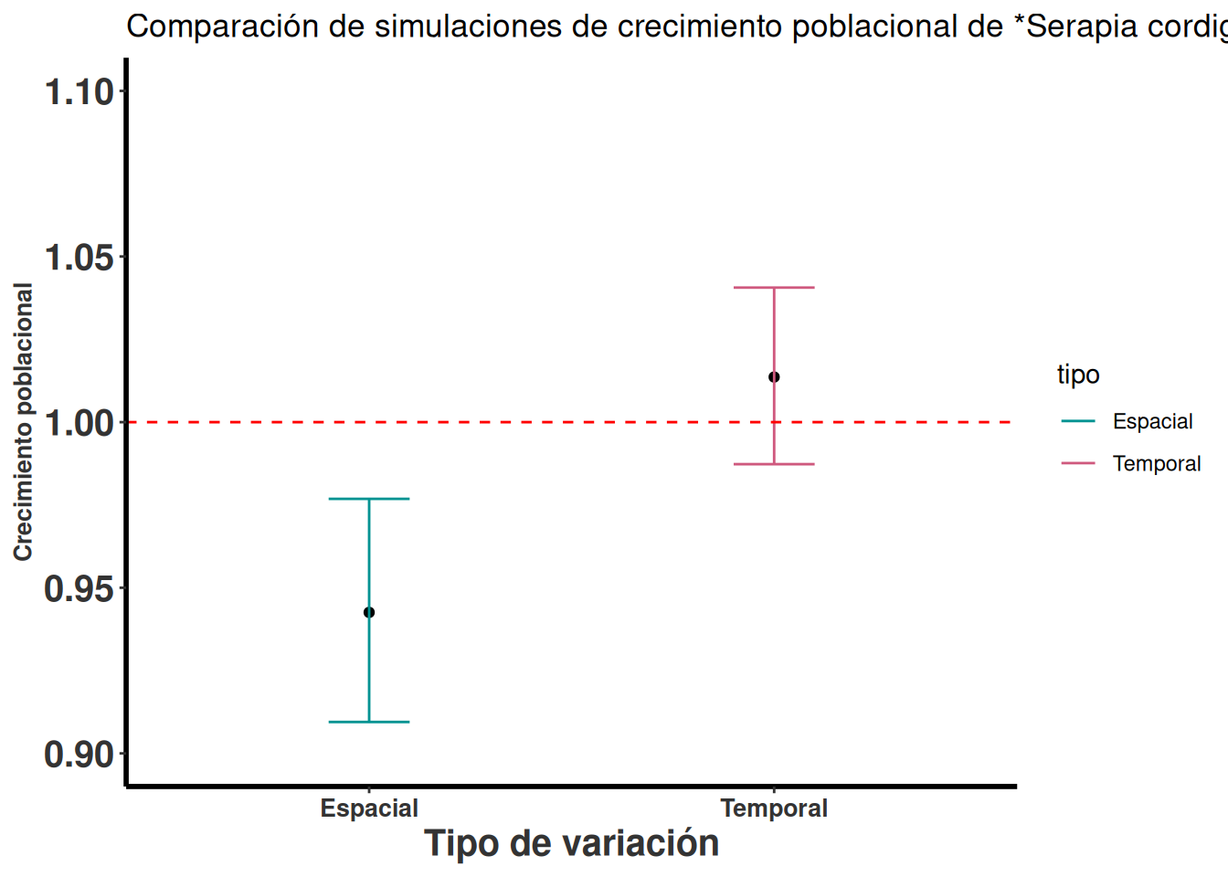 Se nota que el crecimiento poblacional intrínsico de la especies de Serapia cordigera es negativo en la mayoría de las simulaciones cuando se evalúa múltiple poblaciones, pero la población A1 en general tiene un crecimiento positivo o es estable cuando se evalúa tomando en cuanta la variación temporal. La linea horizontal representa el crecimiento poblacional de 1, si el crecimiento poblacional es mayor de 1 la población crece, si es menor de 1 la población decrece. En el análisis temporal vemos que el intervalo de confianza solapa el 1, sugiere que no hay evidencia que el crecimiento poblacional es diferente de estable.