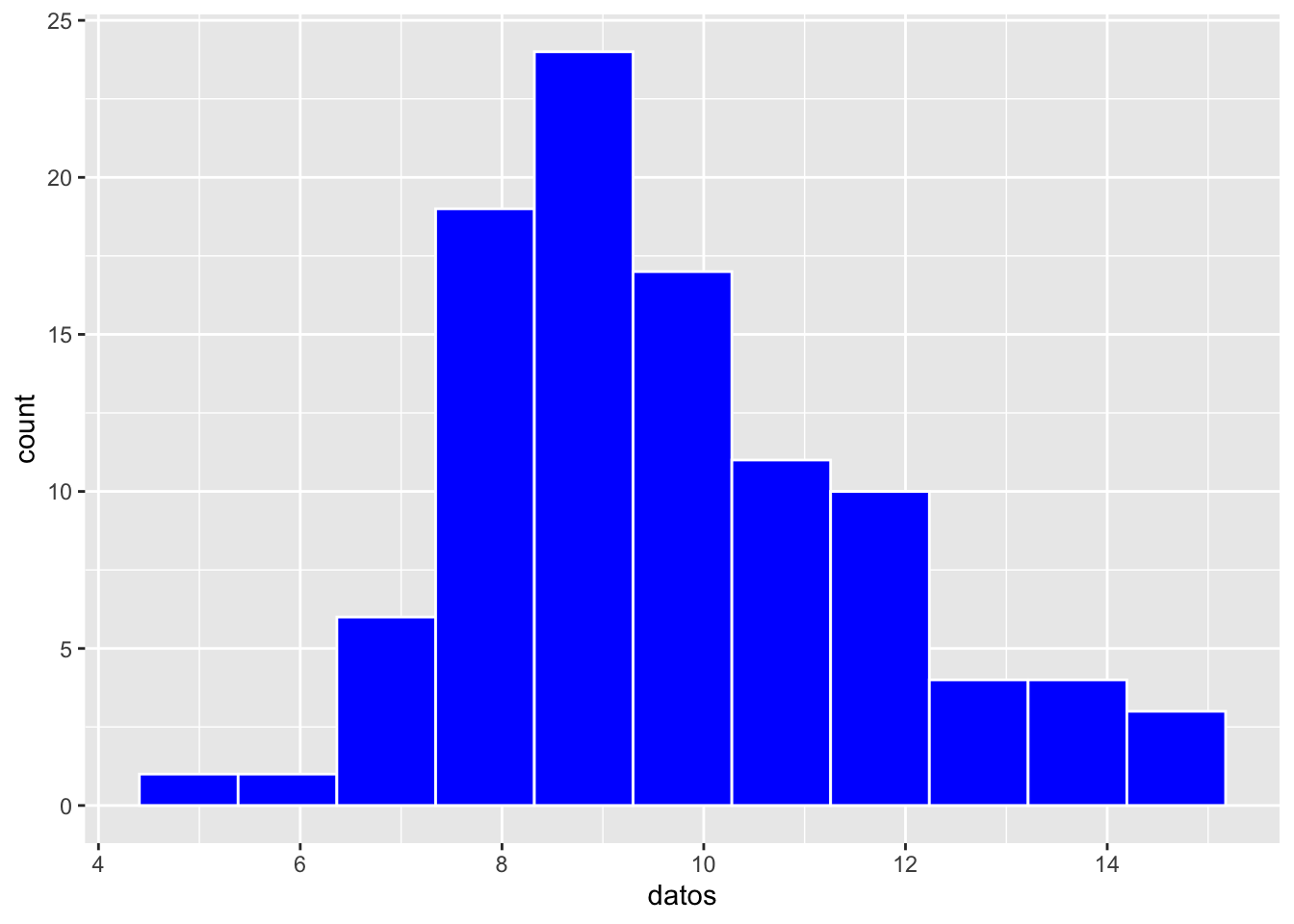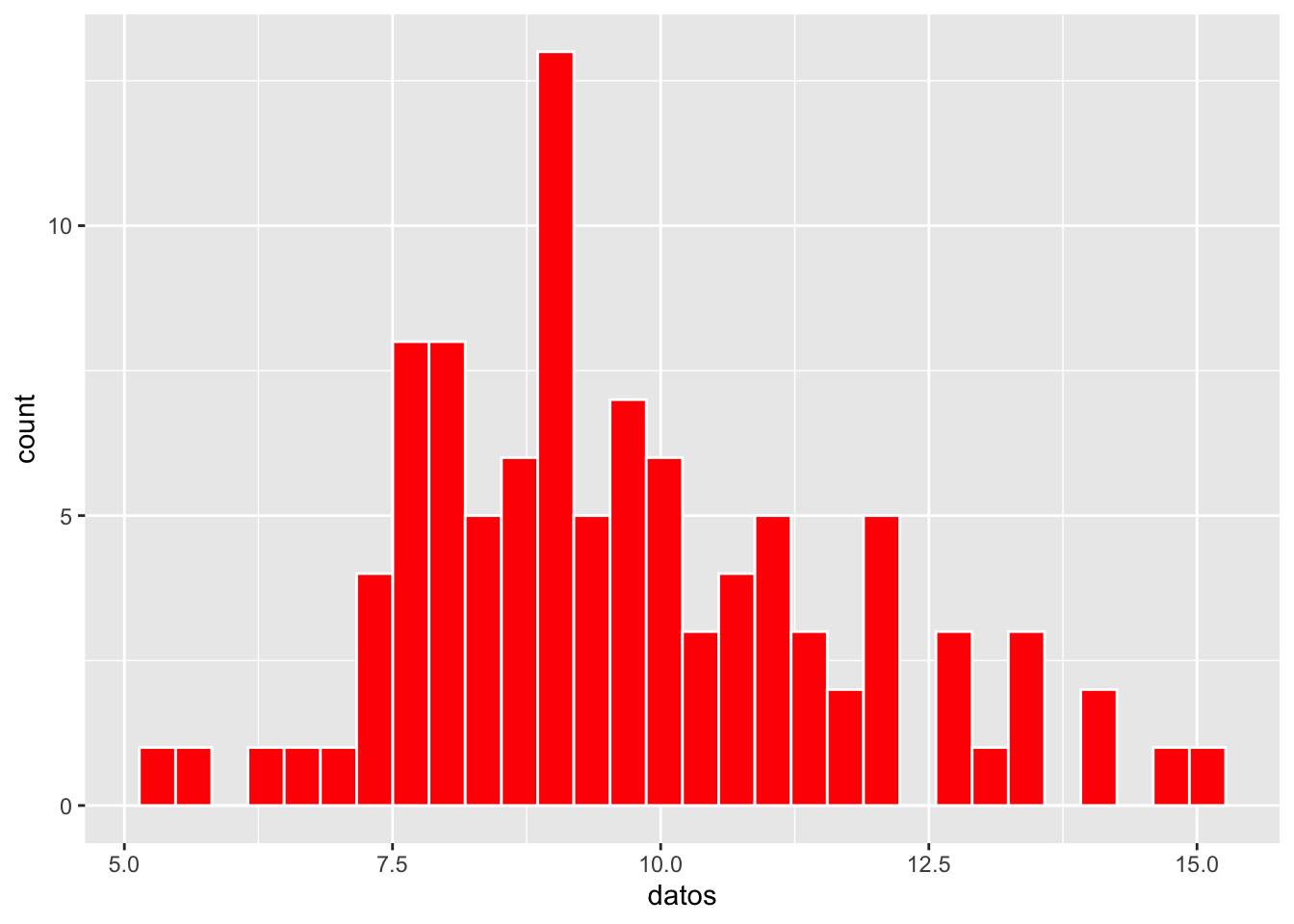 datos # 100 datos de una distribución normal con media de 10 y desviación estándar de 2## [1] 7.585869 10.554858 12.168882 5.308605 10.858249 11.012112 8.850520
